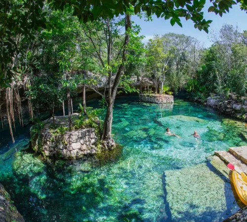 Just west of Puerto Morelos lies the famous “Ruta de los Cenotes,” a jungle road lined with stunning freshwater cenotes. Choose from open-air swimming holes, underground caverns, or adventure parks offering ziplining, ATVs, and rappelling. The cool, clear water offers a refreshing escape from the beach and lets you experience a natural wonder found only in this region. Each cenote has its own atmosphere — peaceful, adventurous, or mystical. A nature-lover’s dream and one of the top-rated Riviera Maya activities.